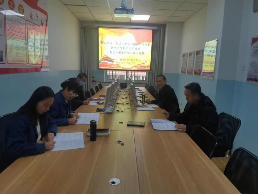为进一步学习贯彻党的十九届六中全会精神和习近平总书记关于职业教育的重要讲话和指示精神,12月10日下午,成人与职业培训公司在实训楼301会议室召开专题会议传达公司关于党的十九届六中全会、全国职教大会等会议精神学习的工作部署,并开展了党的十九届六中全会学习知识竞赛答题活动。