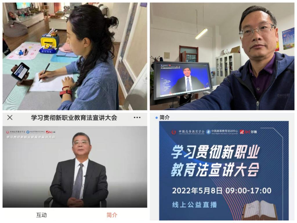 首先,成人与职业培训党总支负责人组织全体教职工参加了5月8日中国高等教育学会主办的“学习贯彻新职业教育法宣讲大会”,会议采取线上报名学习的方式开展。全国人大常委会委员、教科文卫委员会副主任委员、中国高等教育学会会长杜玉波,教育部职业教育与成人教育司司长陈子季,教育部政策法规司副司长王大泉,中国高等教育学会职业技术教育分会理事长、浙江金融职业公司原党委书记周建松,中国职业技术教育学会副会长、北京外国语大学教授孙善学,北京师范大学国家职业教育研究院经理、职业与成人教育研究所所长和震等领导和专家出席会议并作专题报告。报告主题分别为《学习贯彻新修订的职业教育法 努力开创职业教育发展新格局》、《深入贯彻落实职业教育法 推动职业教育高质量发展》、《新修订职业教育法条文概要解读》、《正确把握职业教育法的核心要义》、《职业教育高质量发展的法律指引》、《技能型社会与职业教育的改革展望——基于新职业教育法的思考》。来自全国31个省市自治区,16000余个教育行政部门、职业公司、教育科学研究院、教育科技公司、培训机构、企事业单位的800余万人次参与了线上学习。